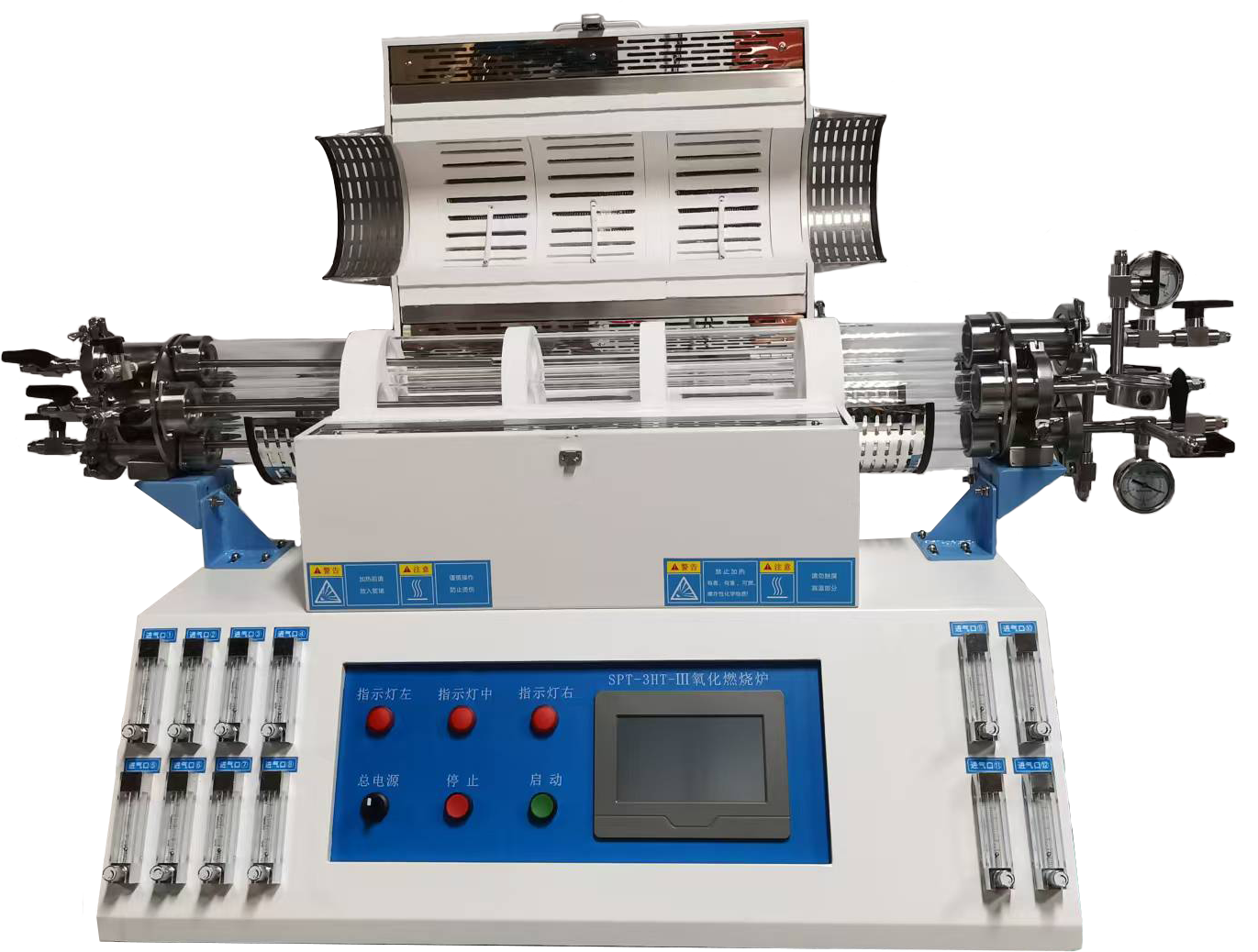 溫控系統 | ?包含一款YD858型溫度控制器; ?PID控制和自整定調節; ?智能化50段可編程控制; ?控溫精度:±1℃; ?三個控溫儀表單獨控制三個溫區; ?系統配采用觸摸屏控制,能夠實時記錄溫度的數值并且進行數據保存。 ?除總電源開關和氣體流量調節外的所有控制都集成在觸摸屏上; ?實驗可以中途暫停,重啟后可選擇中間某一段往下運行; ?升溫速率,PV、SV間采用勻速升溫程序,在設定的時間內按照統一斜率升至目標溫度; ?控溫可實現一鍵同時加熱功能,也可以單個獨立控制加熱; ?樣品區和催化區分別可以存儲不少于20套不同樣品的方案,方案名稱可編輯,每套方案可以設置不少于30個加熱段。 | |